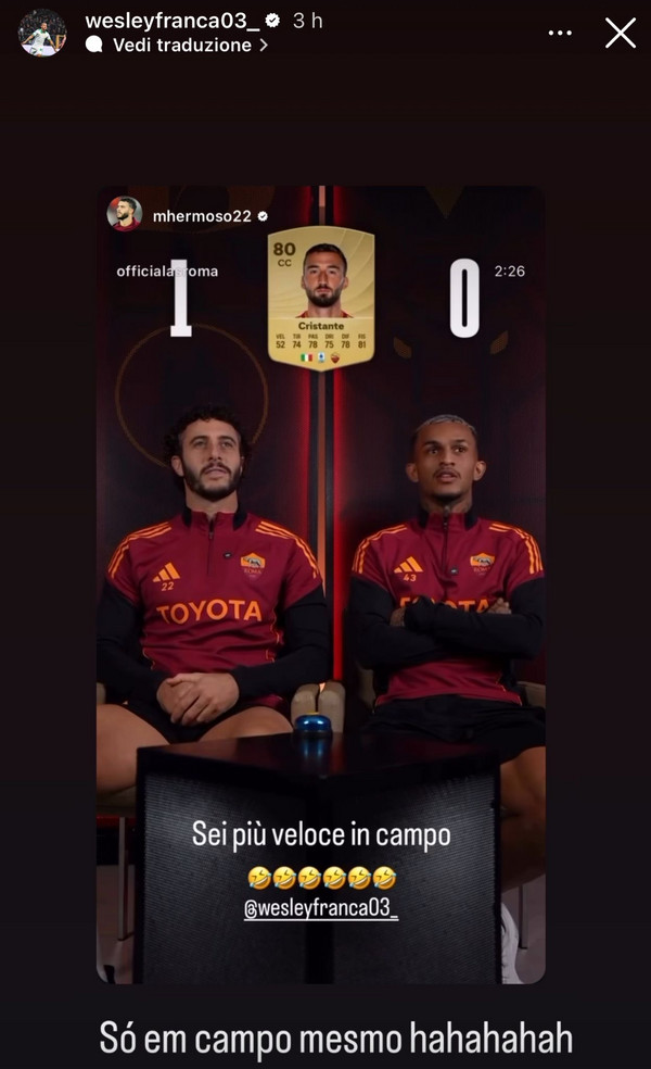 Nuovo episodio di "Guess the teammate", la sfida tutta giallorossa fra calciatori della Roma, chiamati a riconoscere i giocatori da dettagli legati a FC26, vecchie foto o altre immagini. Questa volta si sono sfidati fra sorrisi e battute Hermoso e Wesley: ha stravinto lo spagnolo.