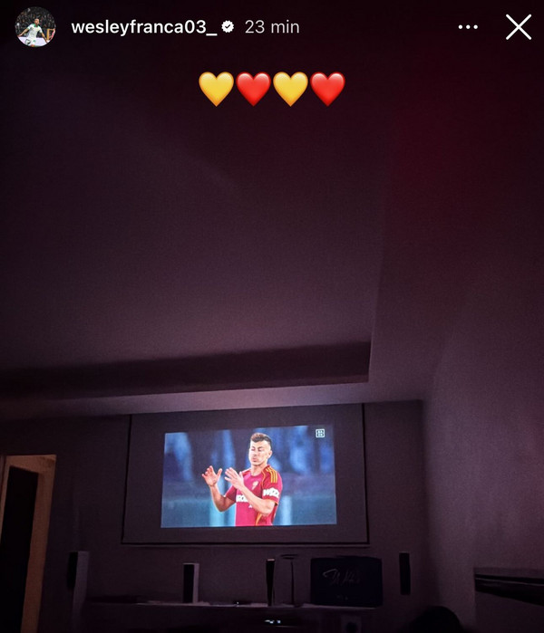 La Roma è in campo contro l'Atalanta allo stadio Olimpico. Gli uomini di Gasperini sono sull'1-1 a fine primo tempo, grazie alla rete arrivata al 45' siglata da Hermoso. Non ce l'ha fatta a rientrare tra i convocati Wesley, nonostante le speranze di Gasperini. L'esterno brasiliano, però, sta seguendo i suoi compagni da casa come testimoniato da uno scatto pubblicato sul proprio profilo Instagram tramite una storia. L'esterno ha pubblicato i cuori giallorossi e una foto della partita in tv che ritraeva El Shaarawy.