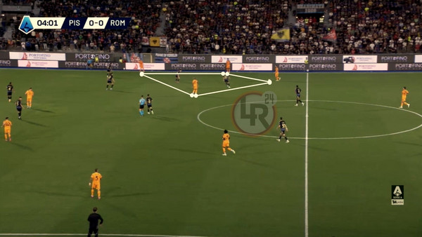 Spesso la Roma apre il mediano di parte, qui lo fa prima Koné e poi Cristante, creando un rombo di progressione.